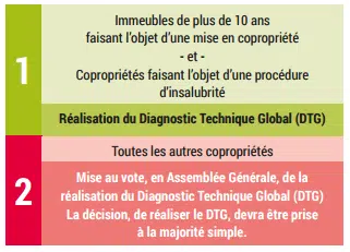 A compter du 1er janvier 2017, la loi ALUR impose la réalisation d’un Diagnostic Technique Global (DTG) des copropriétés sous certaines conditions. Ce nouveau diagnostic, a pour objectif de donner aux copropriétaires un état général de l’immeuble et d’établir un plan pluriannuel de travaux. Cet audit passe par la réalisation d’un état technique et réglementaire de l’immeuble, fixe sa situation énergétique, avec pour objectif d’améliorer la gestion technique et patrimoniale en planifiant et priorisant les travaux à réaliser.